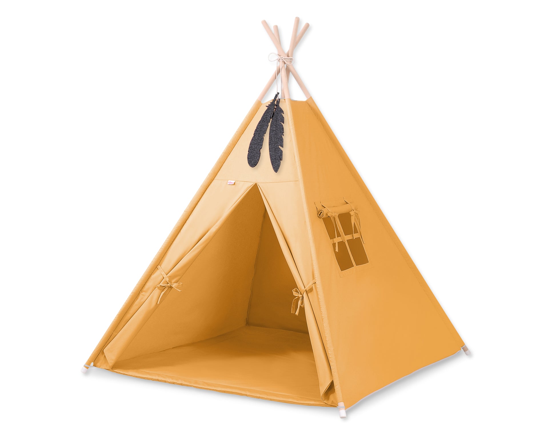Honey yellow teepee tent set for kids including playmat and decorative feathers, adding warmth and fun to any room.