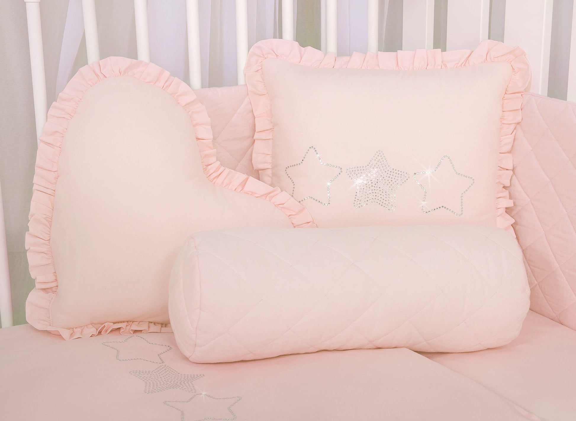 Soft and charming heart-shaped decorative pillow in powder pink, perfect for adding a gentle touch to your baby’s room.