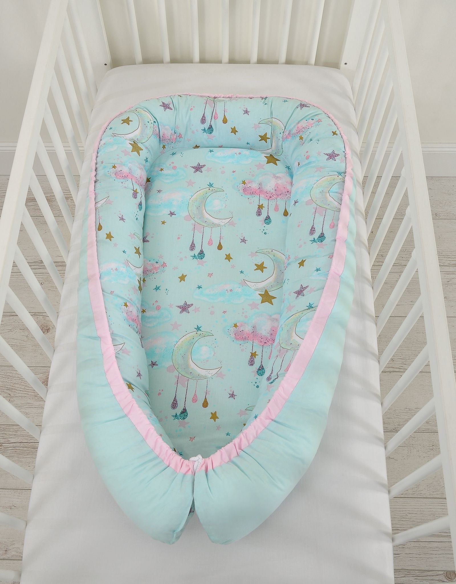 This dreamy mint-colored baby nest by BOBONO features a moon and stars motif for a peaceful, calming atmosphere. Its double-sided design offers versatility and lasting comfort for your infant.