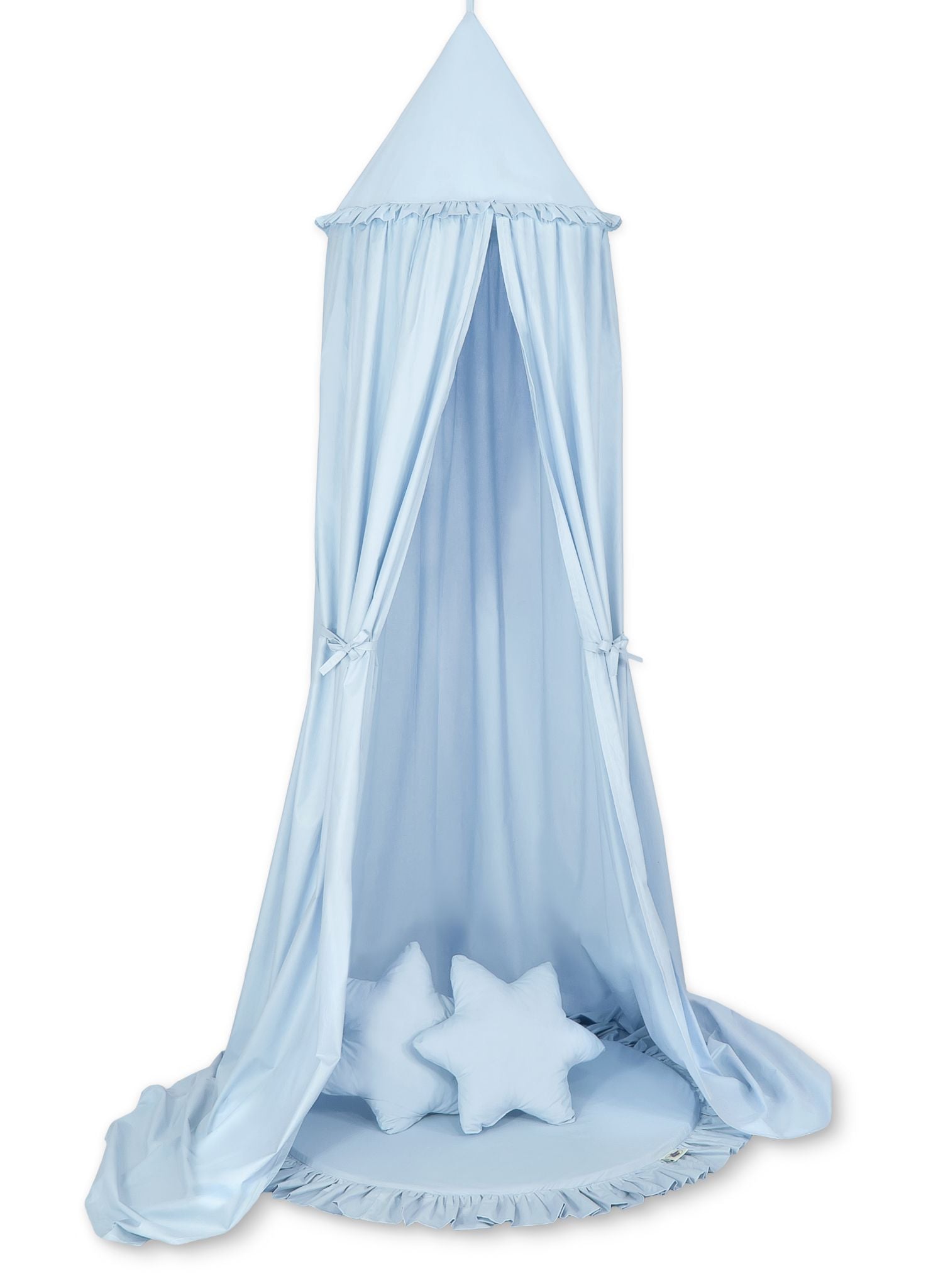 Enhance your baby’s room with this blue set featuring a hanging canopy, floor play mat, and pillows. Stylish and comfortable, ideal for play and relaxation.