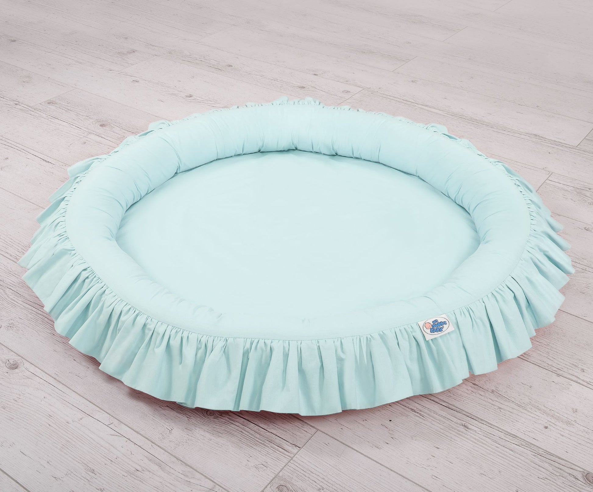 Fresh and calming mint nursery set featuring a hanging canopy and nest with flounce, designed for a cozy and stylish baby space.