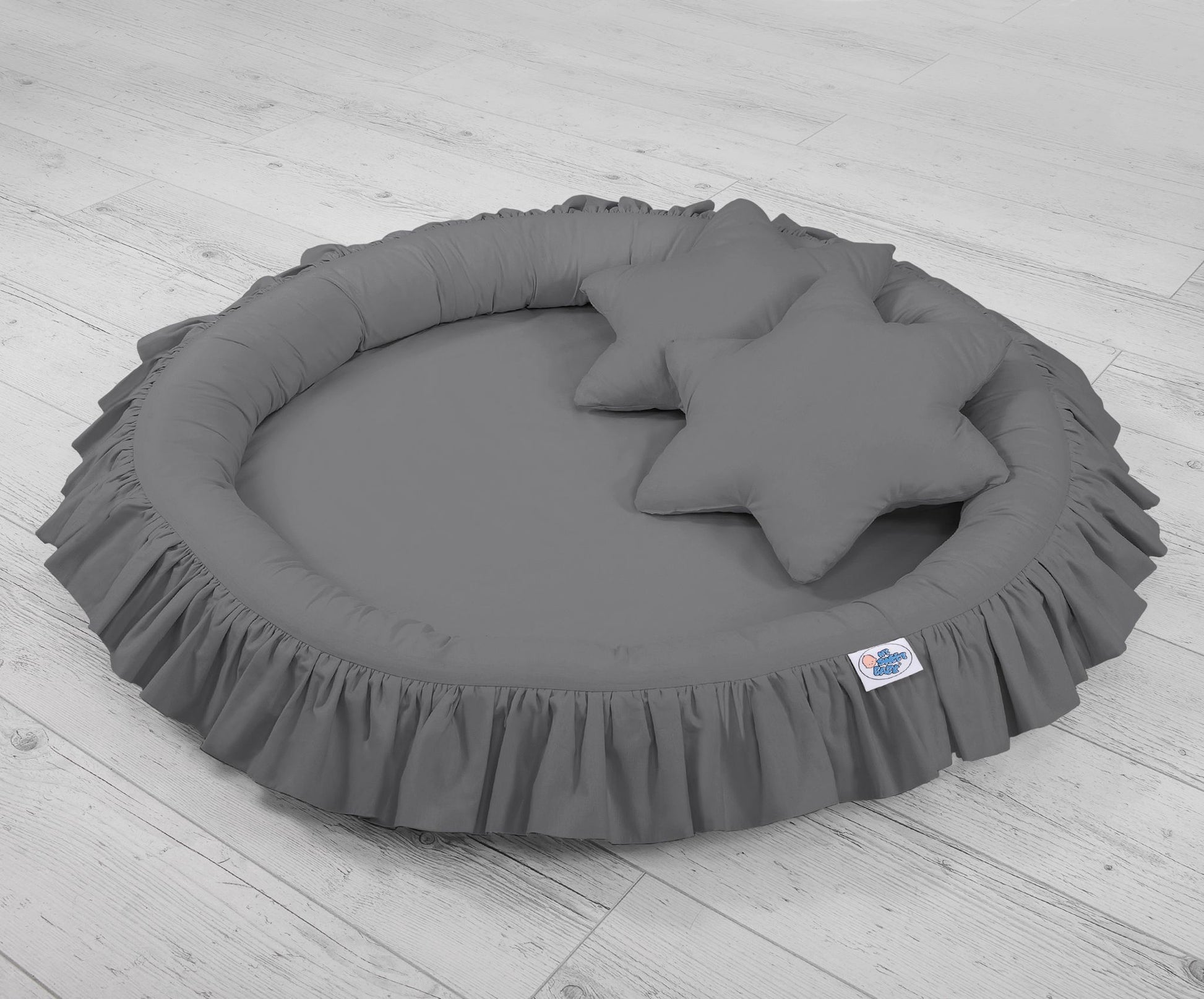 Modern anthracite nursery set featuring a hanging canopy, nest with flounce, and pillows, offering sleek style and comfort for your little one.