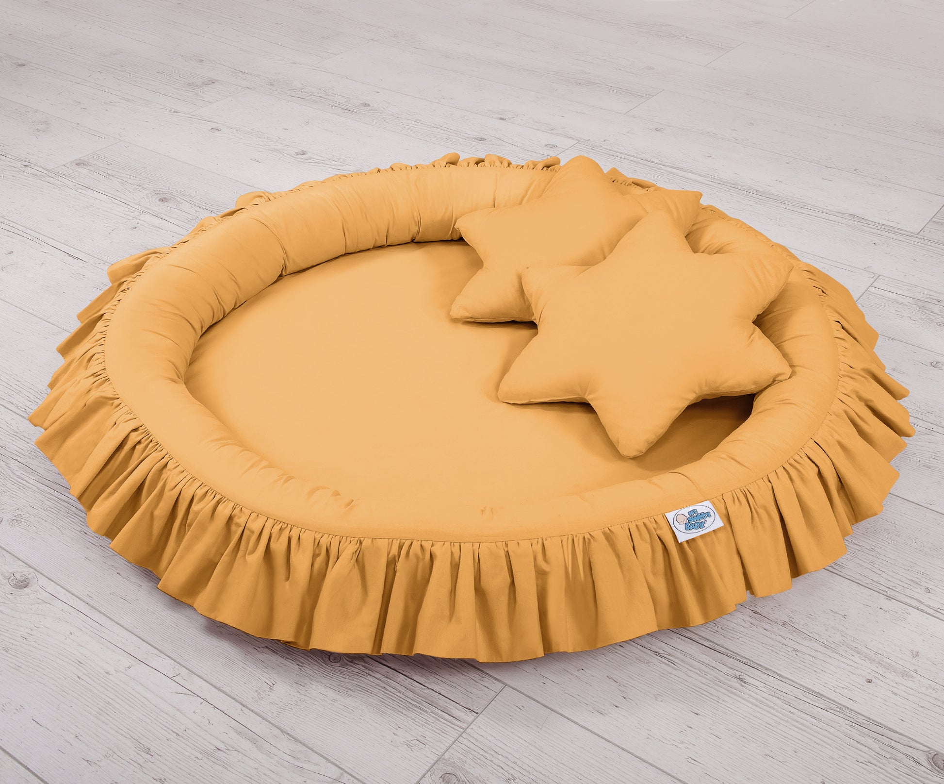 Bright and cheerful honey yellow nursery set including a hanging canopy, nest with flounce, and pillows, perfect for a warm and playful baby room.