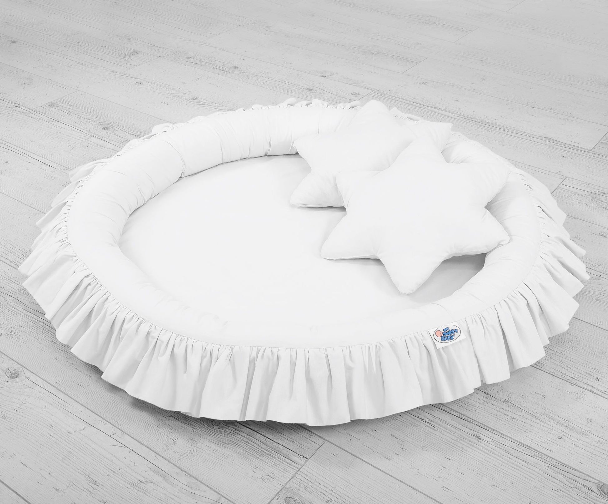 Classic white nursery set including a hanging canopy, nest with flounce, and pillows, perfect for a soft and comfortable baby environment.