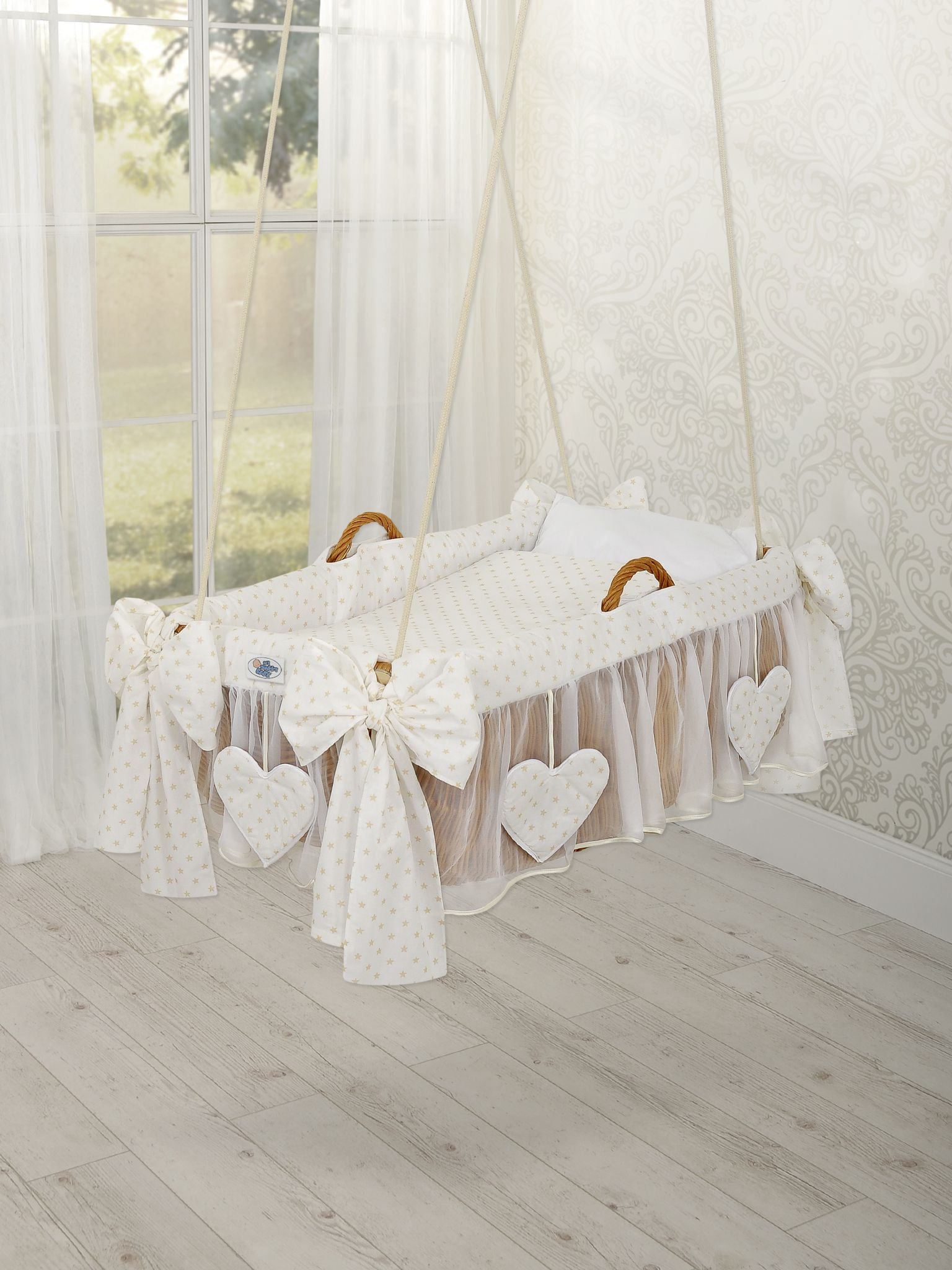 A charming hanging crib decorated with gold stars, creating a magical and cozy spot for your baby to relax.