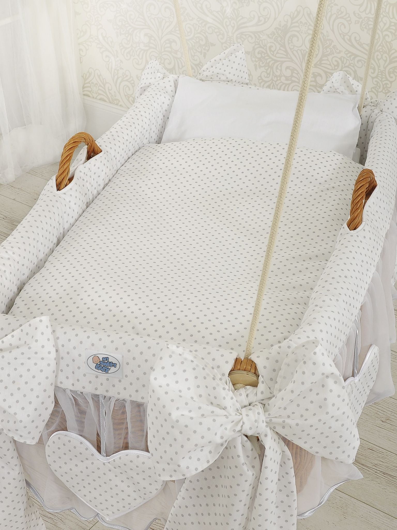 A stylish hanging crib featuring soft grey dots, designed to offer comfort and safety for your little one.